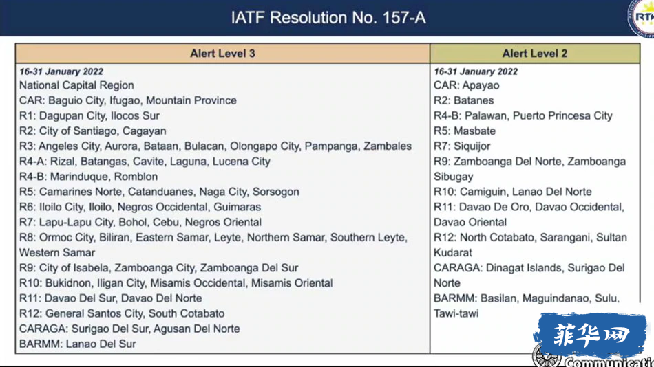 这张来自 Nograles 幻灯片的屏幕截图列出了警报级别 2 和 3 下的区域。