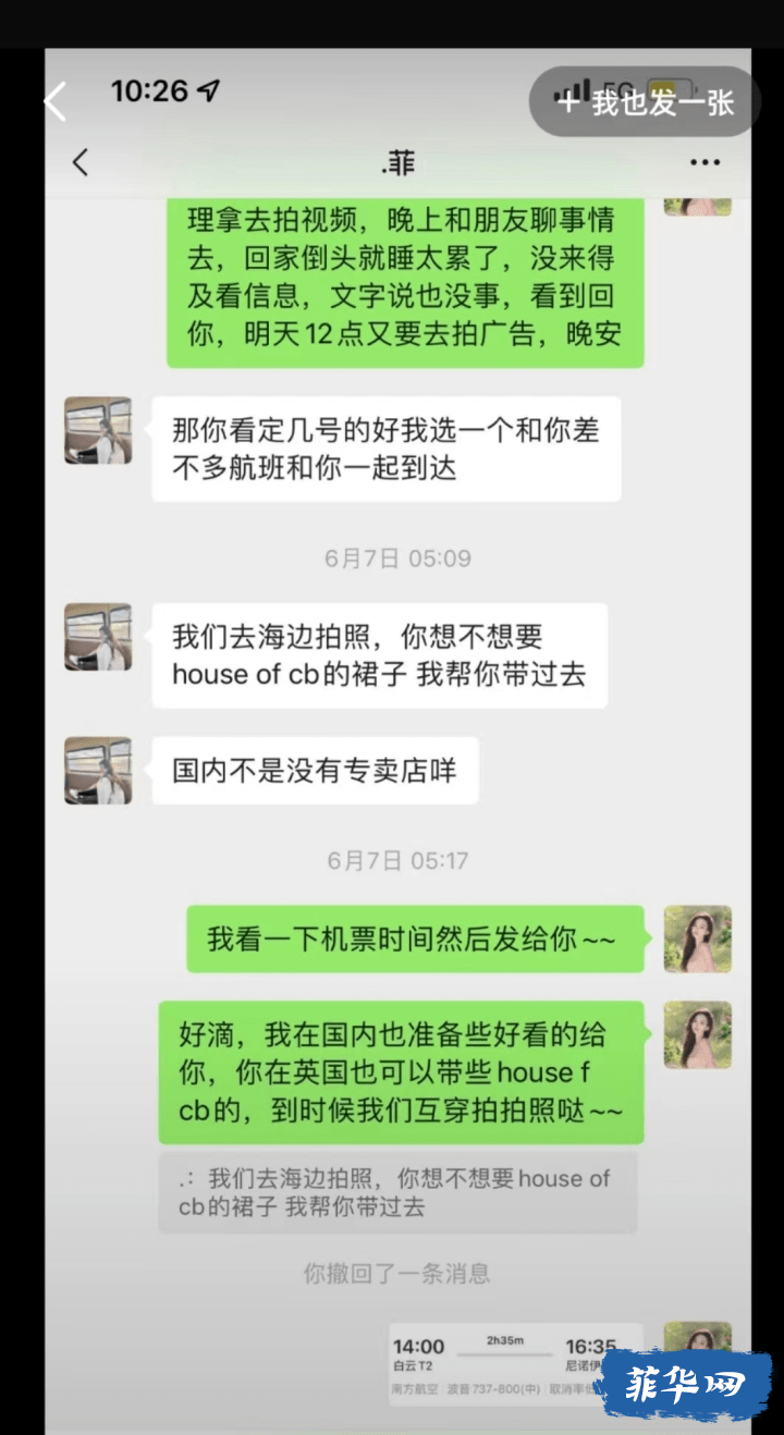 此外,一张网传为「雅典娜Liya」与其闺蜜的微信聊天截图显示:6月7日凌晨,身在国内的「雅典娜liya」与在英国的闺蜜约定一起前往菲律宾海边拍照,闺蜜表示会选择一班时间差不多的航班与其一起到达。随后,「雅典娜liya」向闺蜜发送了一则从广州白云机场飞往菲律宾尼诺伊·阿基诺国际机场的航班信息,起飞时间是下午2时。