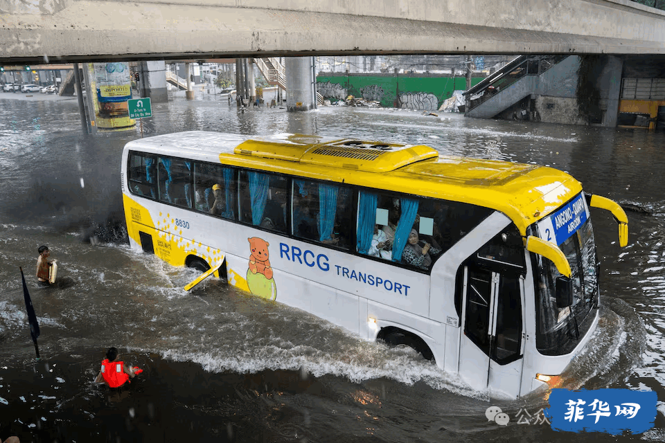 今天中午,马尼拉一辆淹没了下半部的公交车。