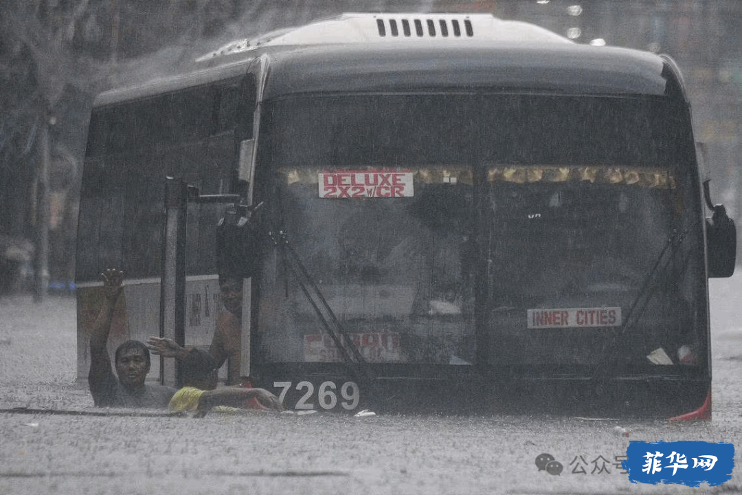 马尼拉,一辆公共汽车涉水行驶在被淹没的道路上。