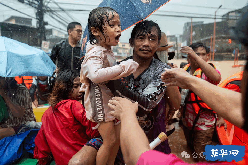 马里基纳市,救援人员协助一名儿童沿着被洪水淹没的道路下船。