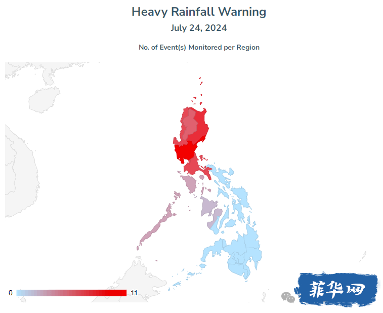 菲律宾强降雨和洪水预警体系的警报级别从低到高依次为:黄色预警,小到中雨,水位缓慢上升,但仍低于警报水位,可能发生洪水;橙色预警,中到大雨,水位持续上升,但仍低于临界水位,可能发生山洪和山体滑坡,建议采取预防措施;红色预警,强降雨,水位高于临界水位,正在发生洪水,建议立即采取行动,必须采取适当的措施;紫色预警,强降雨到暴雨,水位持续上升至临界水位以上,大洪水即将来临,建议疏散。