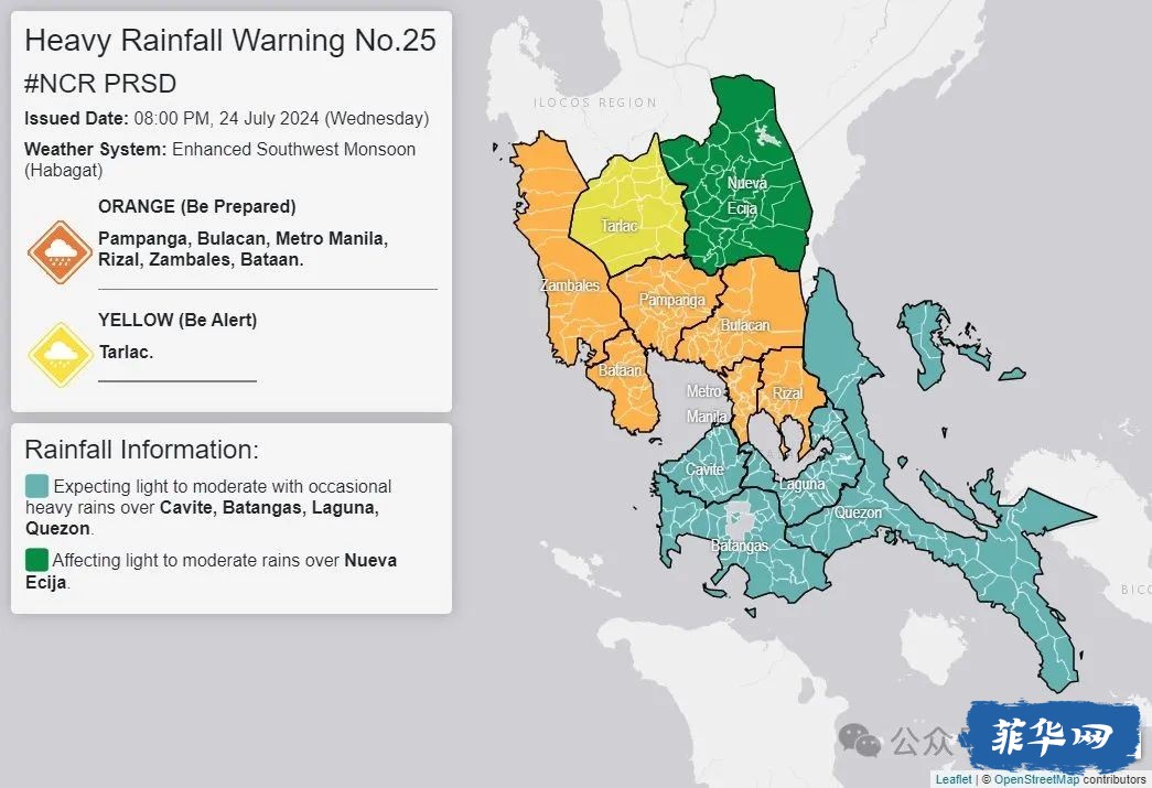 晚上8时气象局预报称,中吕宋邦板牙省(Pampanga)、布拉坎省(Bulacan)、大马尼拉、黎刹省(Rizal)、三描礼士省和巴丹省,洪水橙色预警级别,洪水仍然存在威胁;塔拉克省(Tarlac),洪水黄色预警级别,洪水易发。预计未来3小时内甲米地省(Cavite)、八打雁省(Batangas)、内湖省(Laguna)和奎松省(Quezon)将有小到中雨,偶有大雨。新怡西夏省(Nueva Ecija)的小到中雨。建议公众和相关减灾管理办公室(Disaster Risk Reduction and Management Offices)密切关注天气状况,并留意今天晚上11:00发布的下一次警报。