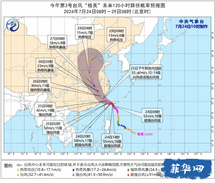 预计“格美”将以每小时10至15公里的速度向西北方向移动,强度变化不大或略有增强,将于24日夜间在台湾花莲到基隆一带沿海登陆(强台风级或超强台风级)。之后穿过台湾岛,将于25日下午到夜间在福建福鼎到晋江一带沿海登陆(台风级或强台风级,12至14级)。然后深入内陆北上,强度逐渐减弱。